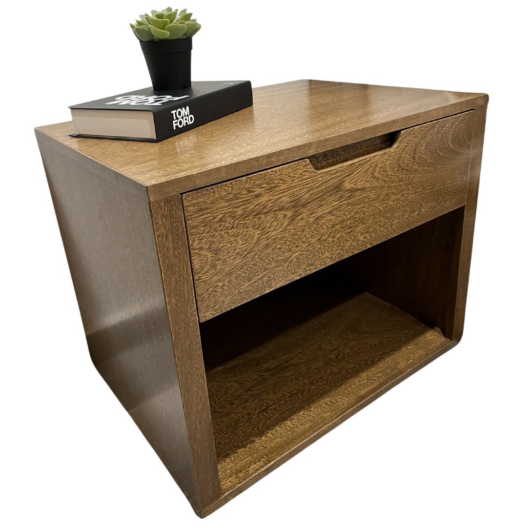 Buró fabricado en chapa de rosa morada en tono nogal o en chapa de nogal americano. Cuenta con un cajón y un espacio abierto ideal para recamaras contemporáneas y modernas.