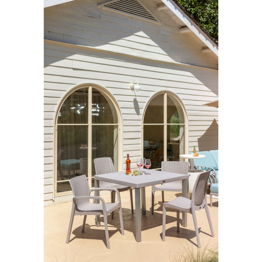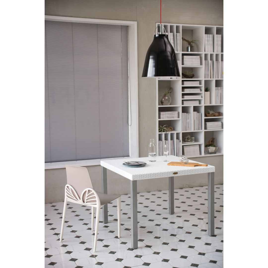 Mesa funcional ideal para espacios exteriores, fabricada en tubular cuadrado de aluminio, cubierta con diseño tipo rattán de polipropileno. Resistente a los rayos uv y al ambiente salino.