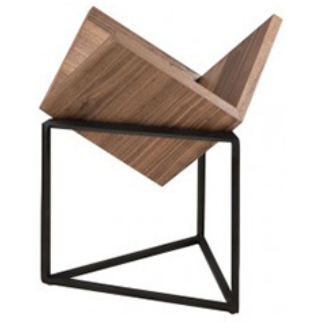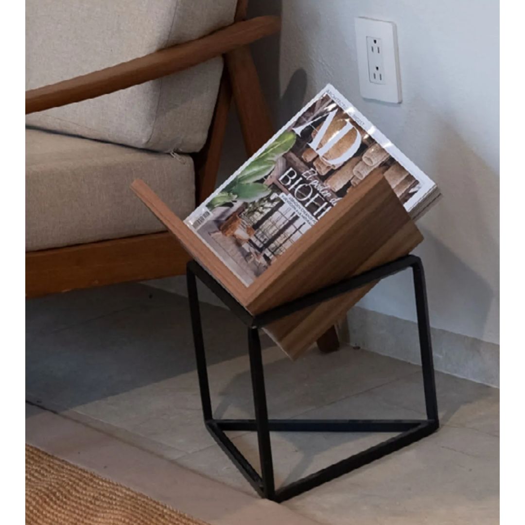 Revistero fabricado en acero de color negro y chapa de madera de nogal.