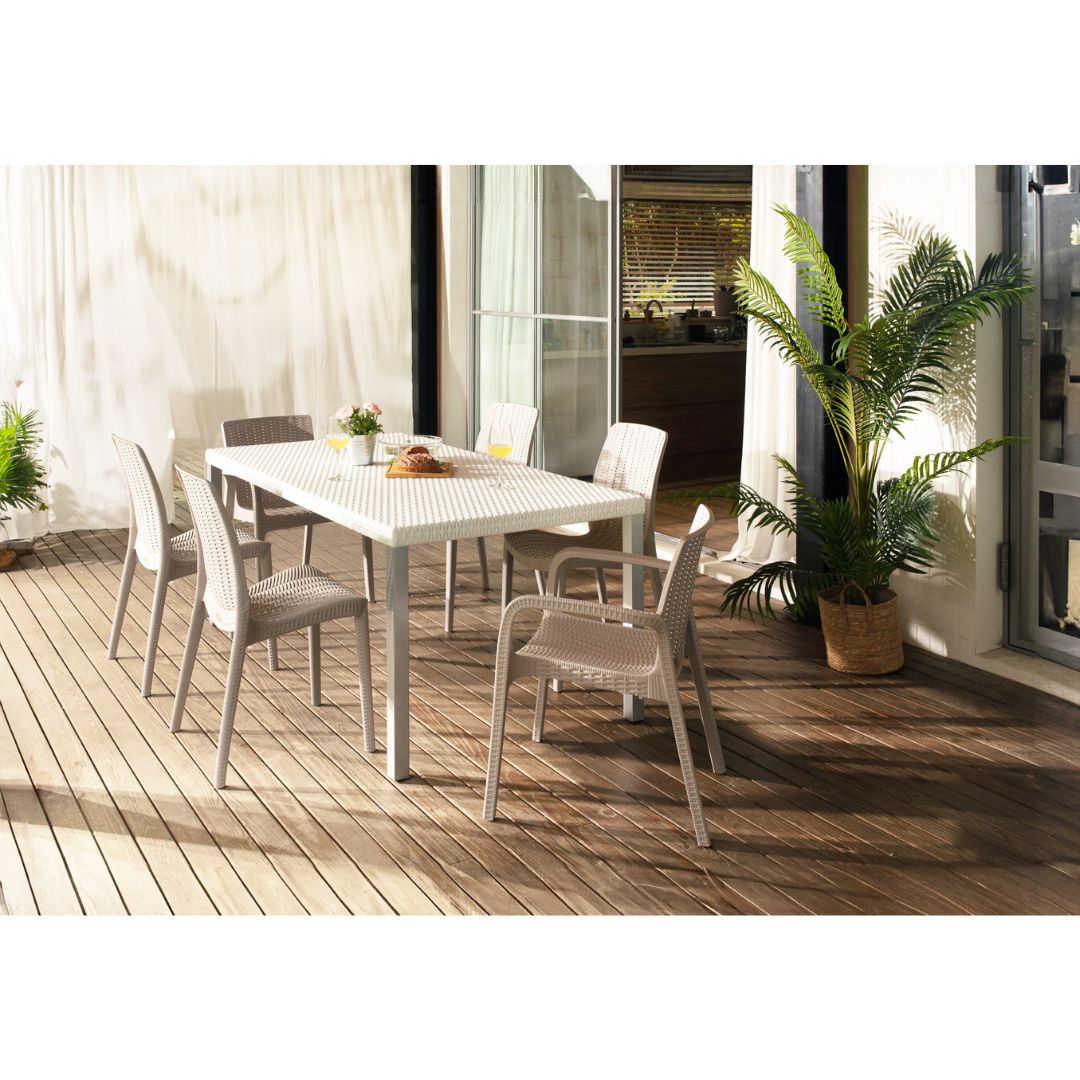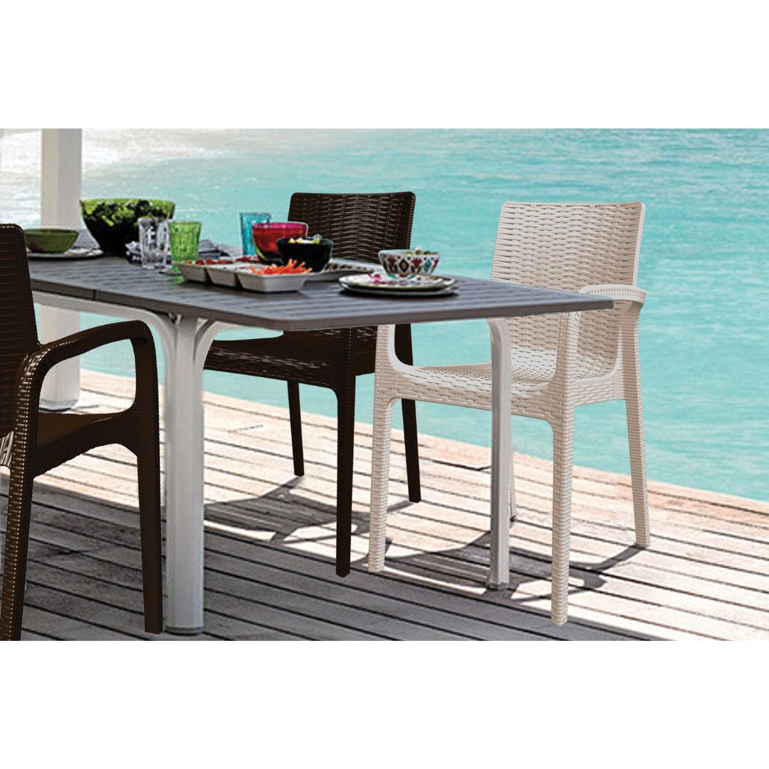 Silla fabricada en polipropileno de alta resistencia y duración para intemperie, resistente a los rayos uv y al ambiente salino. Su terminado en imitación mimbre, le dará el toque ideal a tu espacio. Perfecto para terrazas, restaurantes y hotelería, disponible en diferentes tonos.