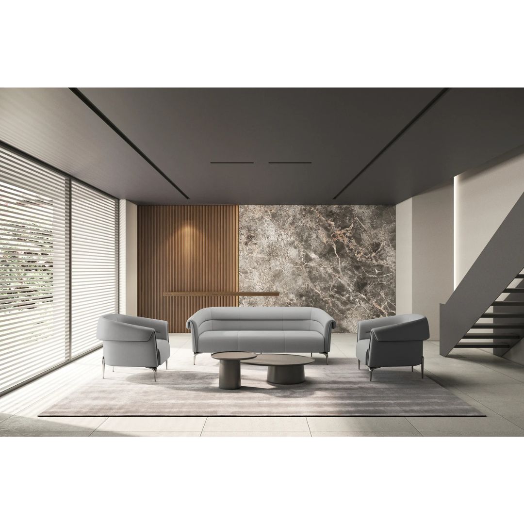 Sillón ideal para tus espacios corporativos. Fabricado en madera de haya de 1ra estufada, refilada y canteada. Acojinado con hule espuma laminada y tapizado en soft revolving leather color gris. Patas fundidas en acero pavonado.